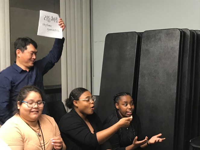 Once the groups were separated we began our charades where the object or animal was written in English and Korean. It was extremely funny and entertaining to participate in as we were all made to use our body to describe the objects and not our words so in the end we were all able to participate together.